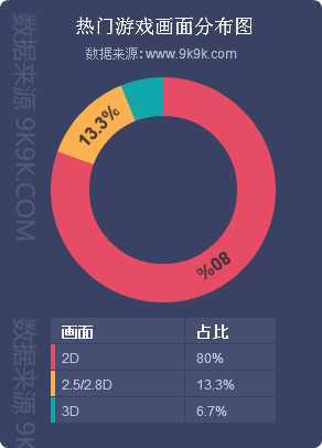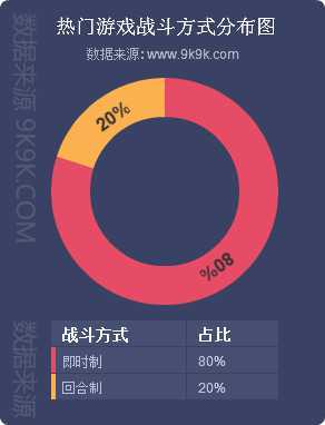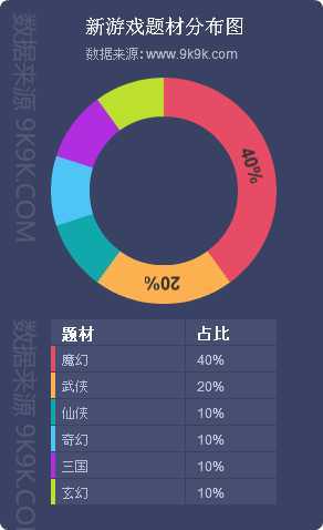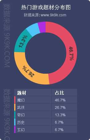 综述:本月热门游戏题材分布中魔幻题材的占比优势明显较上月增加了13个百分点,其中代表作有《大天使之剑》、《斩龙传奇》、《神将屠龙》;本月武侠题材的占比较上月减少了6个百分点,其中新增了一款目前趋势较好的代表作—《魅影传说》;热门游戏在战斗方式上的变化不是很明显,但本月回合制的占比还是有所回升,其中代表作有《独步天下》;画面分布的占比上2D的画面方式更胜一筹,然而目前市场上好的3D产品并不多也是占比悬殊的一大原因。新游戏题材分布上新增了仙侠题材和三国题材,题材之间的占比不是那么的鲜明,但在战斗方式上即时制和回合制的占比分布鲜明。