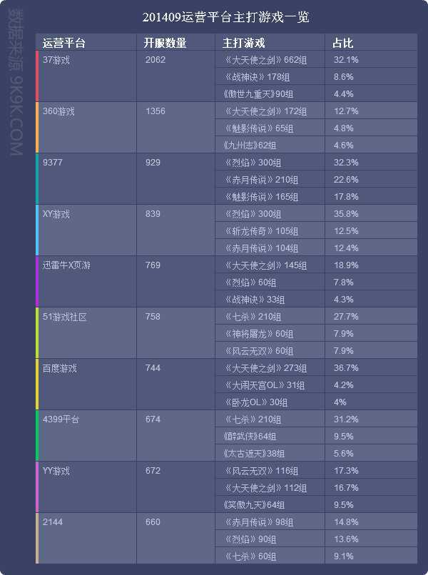 点评:纵观本月网页游戏开服数据,各上榜平台的主打游戏变化诸多:37游戏本月新增《傲世九重天》为主打游戏频率为3服/天,《战神诀》本月在37游戏的开服频率调至5服/天,《大天使之剑》、《攻城掠地》等主打游戏的开服频率未发生变化,37游戏本月正式开区的新游《刺沙》、《斩龙传奇》、《深渊》、《斩龙兵团》、《真三国乱舞》,其中《刺沙》为37游戏的独代产品正式开区后的频率暂定3服/天;360游戏本月新增《魅影传说》、《九州志》两款主打产品,从本月开服数来看两款产品的频率约为2服/天,《大天使之剑》本月的开服频率有所下调较上月减少了59组,360游戏本月新入驻《冰火破坏神》、《武林神话》、《血饮传说》、《斩龙传奇》;9377本月是开服前三平台中唯一开服量小有涨势的平台,新入驻一款游戏《醉武侠》,《魅影传说》的主打趋势越发明显,开服数较上月增加了79组,其他游戏的的开服频率未发生变化。