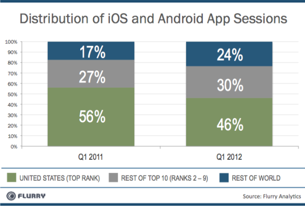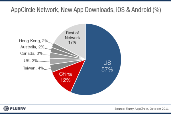 最后一张图,是Flurry公司统计的各国2011年10月份新应用下载比例图,其中中国占到12%。但要注意的是,在去年1月份,这一比例还只有1.2%。