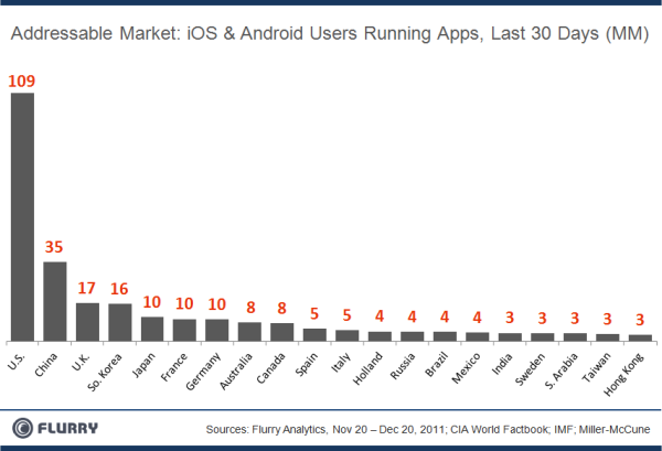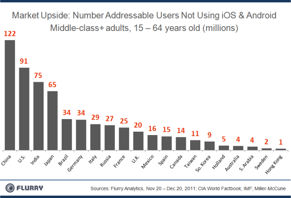 下图是Flurry通过复杂的统计方式对各个国家未使用iOS和Android用户(中产阶级、成人、15到64岁)的统计(详情请点击英文原文)。其中中国还有1,2亿未使用iOS和Android设备,但有能力使用的潜在消费者。也就是说,未来中国市场的潜力仍是最大的,这部分人的转化成本也是最低的。