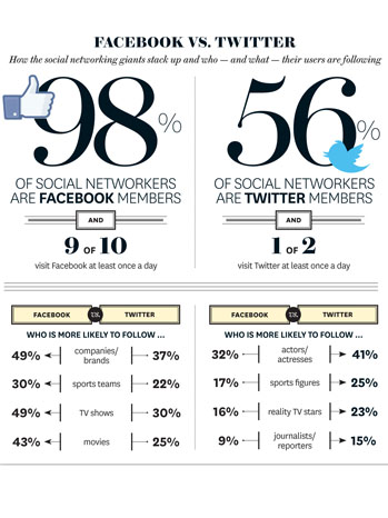 Facebook仍然人多势众,98%的社交网络用户使用Facebook,Twitter用户则只有56%。
