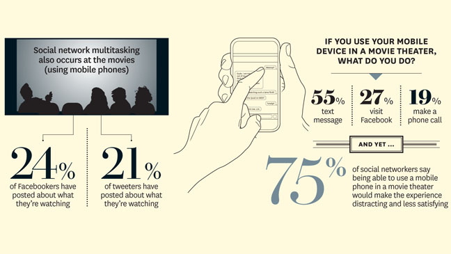 社交网络不仅发生在家庭电影娱乐中,55%的看电影用户在观看电影时间发信息,27%访问Facebook,研究还显示大多数18-34岁的用户认为在电影院观看电影时使用社交网络能够增强他们的体验,将近一半的人更愿意去那些允许发信息和浏览网页的影院。当然有75%的社交网络用户也表示在电影院使用手机让他们分心。
