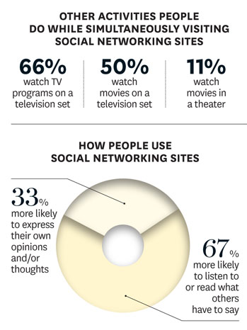 而用户在使用社会化媒体时,有50%、66%的受访者称他们可能在看电影或电视,11%的人称他们可能在电影院看电影;人们在使用社交网站时,67%的人听听别人怎么说,33%的人则更愿意表达自己的观点和想法。