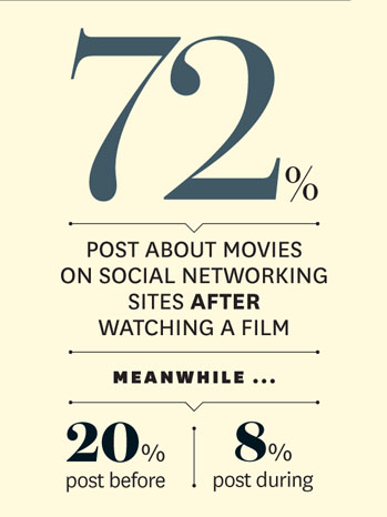 研究显示72%的受访者看完电影后在社交网站上发表和电影相关的内容,20%在观看电影前发表相关信息,8%在观看过程中发表相关信息。