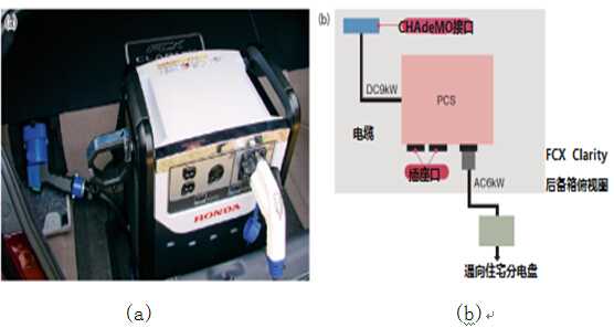 (a)最大输出功率为9kW。家用电器直插接口3kW,对住宅供电6kW。通过为V2H系统新增的CHAdeMO接口与汽车相连输出电流。(b)系统构成。使用V2H系统时,将住宅安装的接线盒的插头插入PCS中即可。