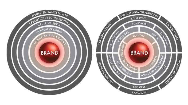这些示意图对银行家有利,它指出了在数字营销技术下面很多不同的子领域中的金融利益;却不利于营销商、品牌和代理。它们在展示广告信息从品牌到消费者的实际流动上简直毫无用处。