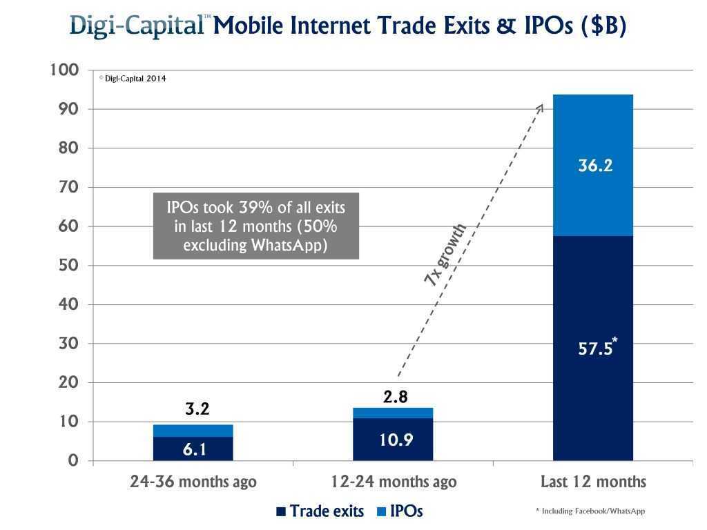通过交易退场(如企业并购)的移动互联网退场活动与上市(IPO)在12个月里截止到2014年Q3期间暴涨7倍达到940亿美元,到2017年移动互联网预期收益达7000亿美元,32家“十亿美元”级别的移动互联网公司现在价值1630亿美元,过去12个月移动互联网接收到的投资超过190亿美元。Facebook/WhatsApp的大量收购成为最大手笔,但是火热的IPO市场占所有退场(不包括WhatsApp为50%)的39%。“虽然这些大数目都很可观,但是退场回报(比如你投资的每一分能换回多少钱)更为骄人。9个移动互联网板块获得的回报高达15.6倍于过去3年投资它们的所有资金”,Digi-Capital总监Tim Merel说道。