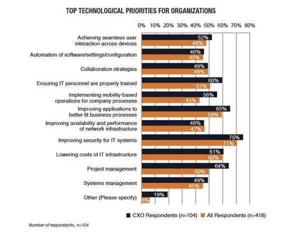 从上图可以看出,提升安全、应用改进与业务流程优化、降低成本和项目管理在企业高管和员工眼里的优先级都很高。其中CXO高官们为以下几项事务给出的优先级高于平均值: