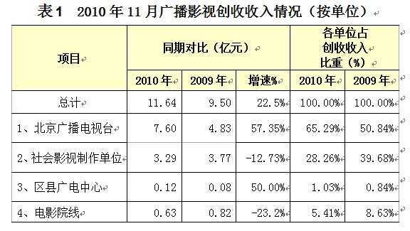 据统计,2010年11月份北京市广播影视创收总收入(含电影票房)11.64亿元,比上月增加1.2亿元,环比增长11.5%,比去年同期增长22.5%。其中广告收入5.74亿元,占本月创收总收入的49.3%,环比增长30.6%,比去年同期增长106.5%;电影票房收入0.63亿元,占本月创收总收入的5.4%,环比下降23.2%,比去年同期下降23.2%。本月广播影视广告收入环比增长幅度较大,主要是电台、电视台广告收入年底前入账大幅增加。详见表1。