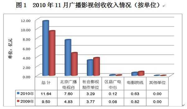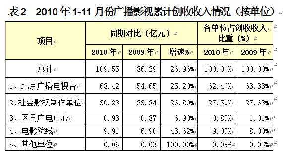 从表2统计数据可以看出,广播影视单位1-11月份累计创收形势良好,收入比重与去年相比变化不大。其中北京广播电视台1-11月份累计创收68.42亿元,比去年同期增加13.77亿元,增长25.2%,占广播影视创收总收入的62.4%。