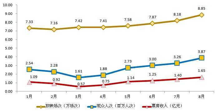 8月份,电影院线票房收入1.65亿元,环比上升17.9%,同比上升52.8%;放映场次为8.85万场,同比增长32.5%;观众人次达3.87百万人次,同比增长42.8%。