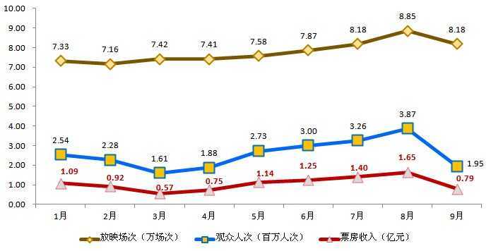 9月份,电影院线票房收入0.79亿元,随着暑期档的结束,环比下降52.12%,同比下降22.55%;放映场次为8.18万场,同比增长29%;观众人次达1.95百万人次,同比下降25.3%。