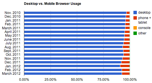 此外,移动浏览器与桌面浏览器所占比例,在过去的两个月里没有明显变化。桌面浏览器仍然占据绝对优势,不过总的来看,移动浏览器的使用率还是在上升。