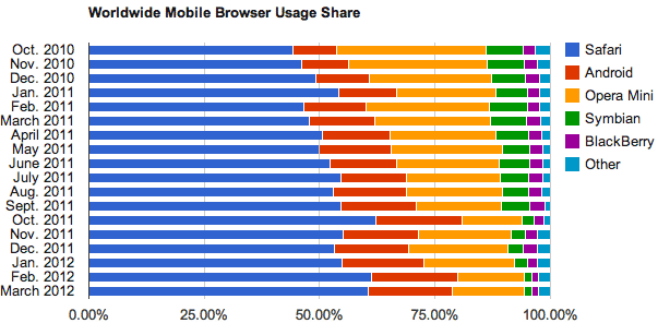 在而移动浏览器领域,微软远远落后于竞争对手,目前只占0.5%的市场份额。虽然Safari市场份额从2月份的61.2%下降到三月的60.5%,但它仍然占据移动浏览器市场主导。同时Android浏览器由18.6%下跌至18.3%,Opera由14.4%上升至15.4%。