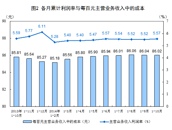 1-10月份,规模以上工业企业主营业务收入利润率为5.57%,每百元主营业务收入中的成本为86.02元,每百元资产实现的主营业务收入为123元,产成品存货周转天数为13.7天。