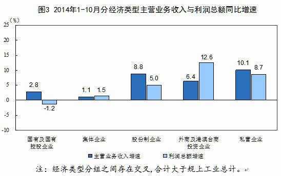 1-10月份,在规模以上工业企业中,国有及国有控股企业实现利润总额12100.3亿元,同比下降1.2%;集体企业实现利润总额415.2亿元,增长1.5%;股份制企业实现利润总额32626.5亿元,增长5%;外商及港澳台商投资企业实现利润总额12045.3亿元,增长12.6%;私营企业实现利润总额16491.7亿元,增长8.7%。