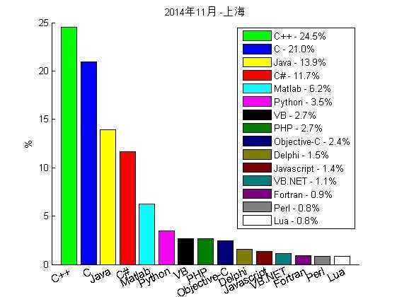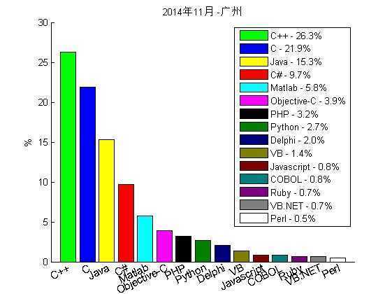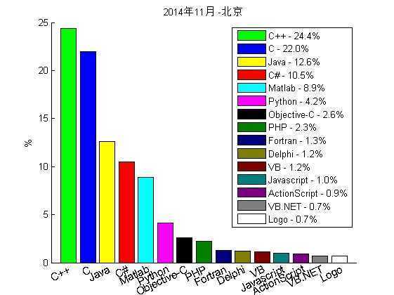 与前几个月的统计数据相比,11月份的统计数据中C++和C语言仍然以大比分领先其他编程语言排在前两位,二者是当之无愧的最受全国程序员喜爱的编程语言(或者说从事C++和C语言编程的人数依然占有最大比例)。Java和C#也很受欢迎,分别排在第三和第四位(C#在这个月份略有下降到第四位,Java略有上升到第三位),位次彼此调换。Matlab因其在数学计算和仿真方面的优势以及易学易用的特点,深受高校和科研院所人员的喜爱,也是很多软件工程师验证前期算法的首选工具。Objective-C虽然受到iOS程序开发的刺激,吸引了大批程序开发人员从事编码工作,但在这份喜爱程度排行榜上并不出众。尽管如此,与前期统计数据相比,Objective-C呈上升趋势。当年极其盛行的Delphi靠吃老底仍然跻身榜单之中,不过数据一直呈现下降趋势。