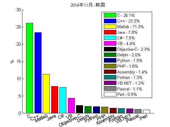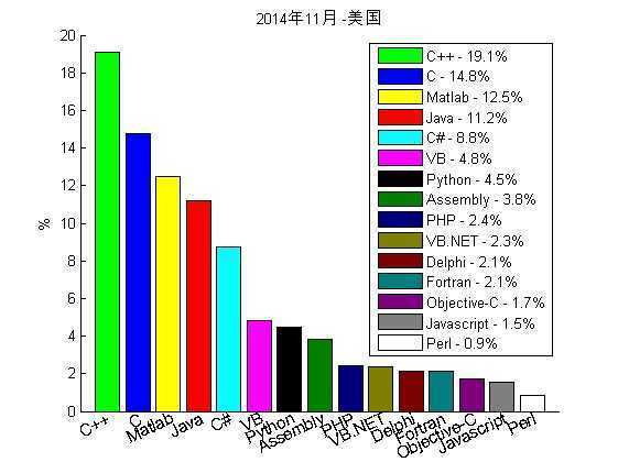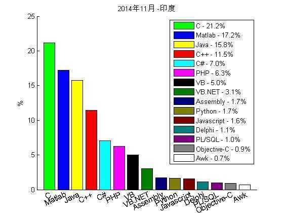 在全球范围内,C,C++和Matlab的受欢迎程度高居榜首,位列三甲。在IT创新最活跃的美国,C++胜于C,而在软件外包大国印度,C与Java都大受欢迎。在制造业发达的台湾和韩国,C语言很受欢迎。Matlab在这几个国家和地区中,都排在前三位,其中,在印度排在第二位,这与这几个国家和地区发达的教育和科研制度是分不开的。
