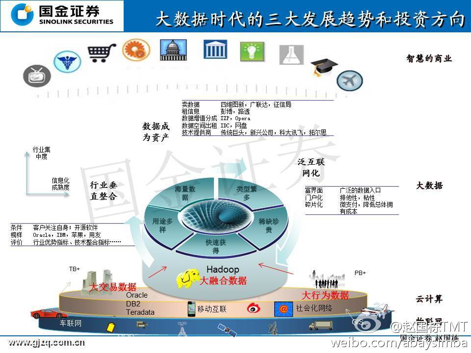 在详细说明三大发展趋势之前,我先强调一下,大数据对传统企业影响。第一,文化的颠覆和组织的重构。传统的金字塔式的组织结构一定是过时的,必须全面转向以客户和消费者为中心,重新梳理公司的战略、文化、组织。期间有大量的咨询业务机会。第二,对信息系统的冲击。传统架构的信息系统无法应对海量数据,首先存不了,其次也无法在多种数据间建立联系,也就无从分析,更谈不上快速有效。我原来给运营商做商业智能的项目,运行一天出结果,就不错了。但大数据要求是1秒有答案。这种差别是巨大的。所以信息系统面临升级换代的要求。第三,企业管理经营必须和信息系统完美对接。管理要标准化、标准要流程化、流程要信息化、信息要智能化。而且我们还观察到一些咨询公司收购软件企业,为客户提供包括战略咨询到信息化建设的完整服务。