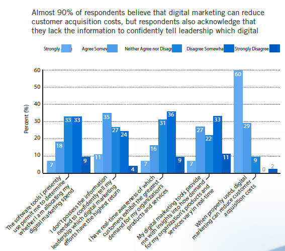 参与者表示他们获取到了客户数据,并且拥有人才和资源去数字分析。但是他们怀疑他们能够360度洞察用户,或他们能够准确评估活动效果和商业价值。这显示出这些组织所采用的工具并没有达到企业所预期的效果。企业需要好好检查他们的体系是否能够让他们真正挖掘数字营销数据的价值。