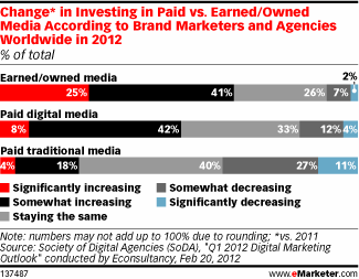 将免费和自有媒体,如社会化媒体与企业的营销矩阵相结合,能够减低总体的广告支出。2012年2月来自Association of National Advertisers (ANA)的研究发现84%的美国广告主成他们目前面临着明确成本节省和减少2012年营销活动的挑战,该比例比2011年的77%还高。