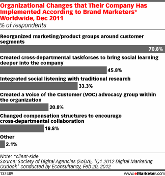 社会化媒体的影响远不止于营销,还在影响企业的组织架构。几乎73%的营销业者称他们正在根据用户划分调整他们的营销部门,45.8%创建了跨部门的组织来开展社会化媒体监控和其他社会化洞察工作,大约1/3的人专门在传统研究部门中整合社会化倾听策略。