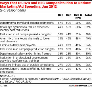 尽管很多B2B和B2C企业通过节省旅行和部门支出以及广告代理费用来节省成本,50%的B2B营销业者打算减少广告营销活动预算,B2C营销者比较不愿意减少广告预算,只有44%打算这样做。但是很高比例的B2C营销者(45%)打算通过调整营销矩阵组合来降低成本。