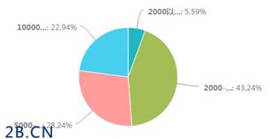 数据表明,约一半(43.24%)的员工收入处于2-5千元之间,和2013年(44.52%)基本持平。5-10千的员工占比28.24%,和2013年(29.03%)也基本持平,超过万元的员工比例比2013年(19.35%)增加了3.59个百分点,而低于2千元的员工比例也比2013年(7.10%)有所降低,为5.59%。B2B员工收入应处于电子商务行业中等偏下水平。