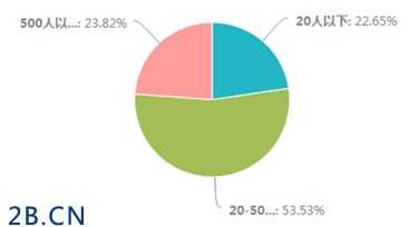 从数据来看,20至500人的中型企业占比最高,达到53.53%,而500人以上的大型企业占比也不低,达到23.82%,这表明国内B2B企业较为稳定成熟,已经具备一定规模,而20人以下团队占比22.65%,数量也不少,结合调查8,创业时间1年以下企业占比9.71%,表明看好行业发展与未来的人群也不在少数。
