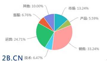 数据显示,销售人员占比最大,占比达到33.24%,替代了2013年运营岗位(32.26%),这是否意味着B2B企业2014年业绩KPI压力较大,销售人员增加?运营人员点比24.71%,表明B2B企业运营仍然占据重要位置。市场人员占比13.24%,产品、技术和客服占比较低,表明B2B企业在产品、技术和客服上的重视程度相对较差。