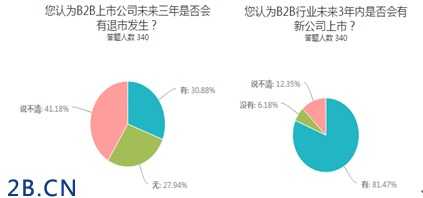 上市公司往往是行业向上的标志,对电子商务行业来说尤其如此。81.47%的从业人员认为未来3年将有新公司上市,而30.88%的员工认为会有公司退市。信心指数较高,但看淡指数也不低。这是否表明B2B行业员工内部看法出现了一定程度的分歧?方向不明的情况下,此种分歧很正常。