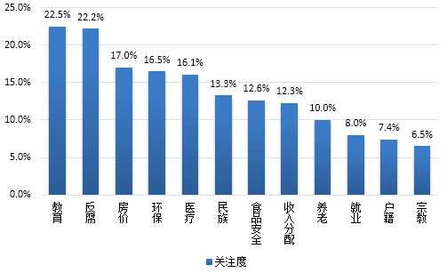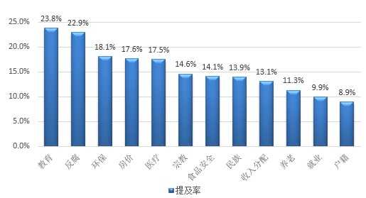 《报告》将近年来关注比较多的社会议题归纳为反腐、房价、收入分配、环保、户籍、医疗、食品安全、就业、教育、养老、民族、宗教等12项。对1800位网络样本用户的统计分析表明,12大议题的提及率由高到低依次为教育议题23.8%、反腐议题22.9%、环保议题18.1%、房价议题17.6%、医疗议题17.5%、宗教议题14.6%、食品安全议题14.1%、民族议题13.9%、收入分配议题13.9%、养老议题11.3%、就业议题9.9%、户籍议题8.9%。