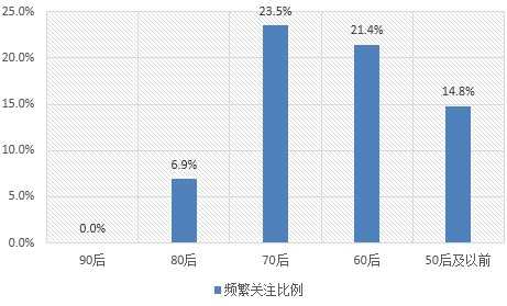 此外,在各年龄层用户中,50-70后用户比80、90用户更频繁关注收入分配议题。数据显示,50、60、70后频繁关注收入分配议题的比例为22.7%、19.0%、18.6%,80后频繁关注收入分配议题的比例为6.6%,而90后样本用户中基本无人持续关注收入分配议题。