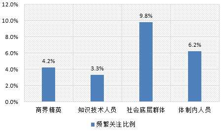 社会底层群体中25.6%关注了反腐议题,其中频繁关注者占该群体的11.9%,在四大群体中名列首位。社会底层群体与体制内人员的频繁关注比例是知识技术人员频繁关注者比例的近1.5倍,是商界精英频繁关注者比例的5倍左右。