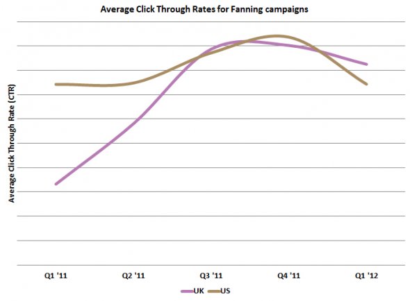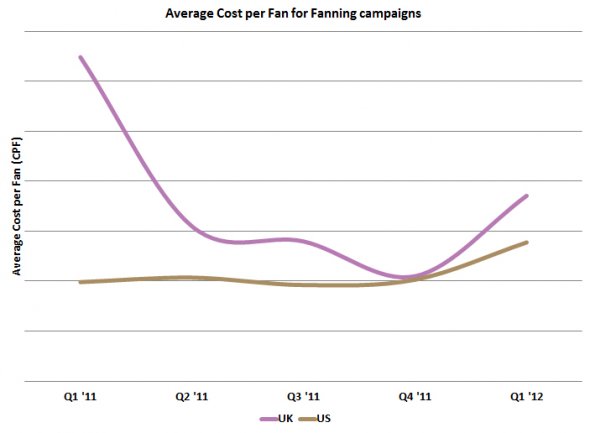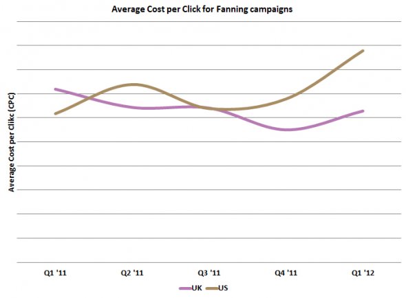 2011年Q1到2012年Q1期间,Facebook广告的CPM增长了41%,这意味着Facebook从展示的每一个广告上面收到的钱更多了。2012年Q1,Facebook的CPM比2011年Q4增长了15%,美国增长了11%,而英国增长了13%。