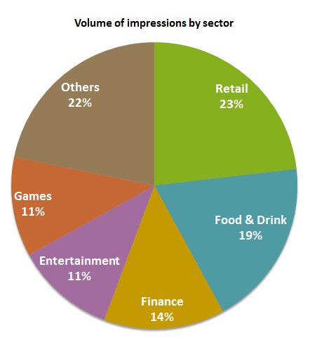 2012年1季度,零售网站的广告展示增长了10个百分点,占Facebook广告展示的1/4。这个增长可能是由于零售商开始使用Facebook作为发现工具,并作为一种向Facebook粉丝沟通新产品,销售的手段。五大主要类目占据了广告展示的78%。