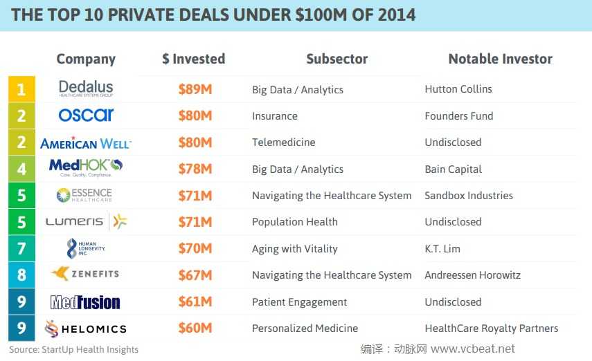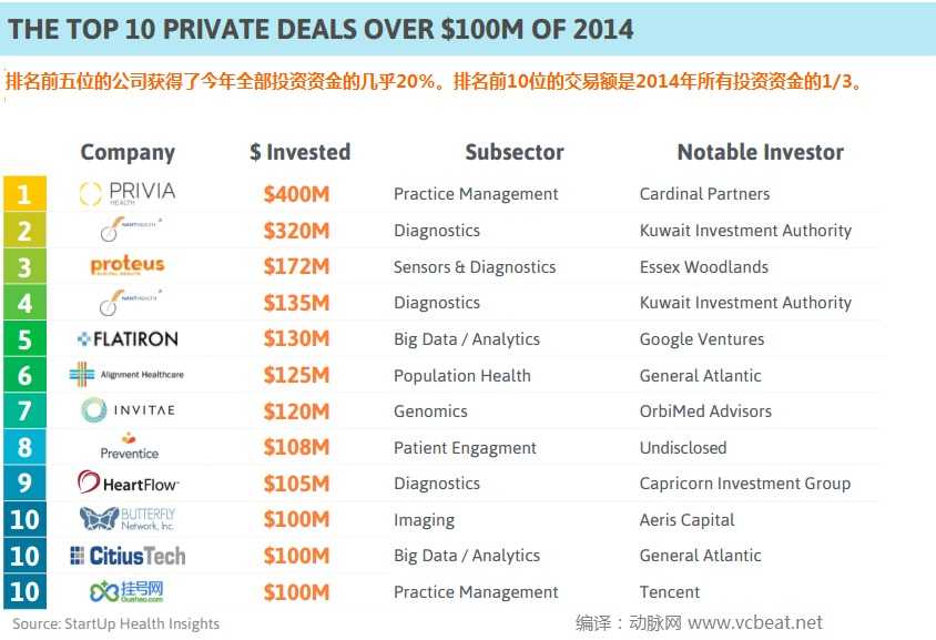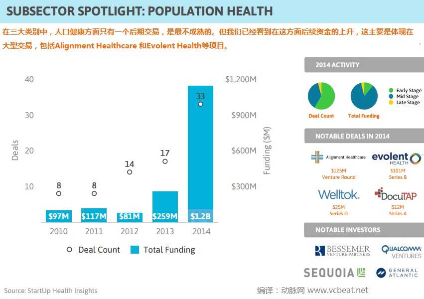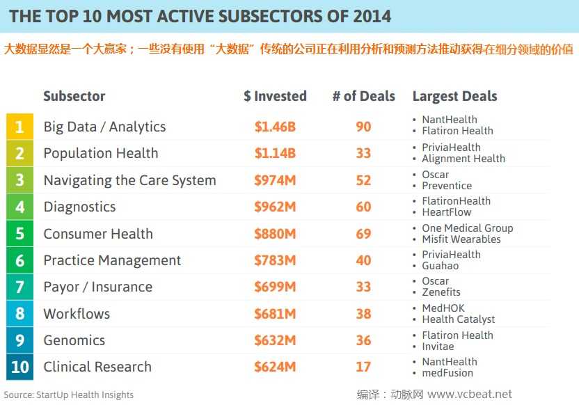 医疗改革不断刺激创新:因为激励结构的变化和新处罚政策生效,到2015年,医疗服务提供方和支付方期待企业家能提出有效的解决方案。来自于以下三个方面获得了2014年最大金额的私人资金,即大数据/分析(15亿美元)、公众人口健康(11亿美元)和医疗保健系统导航(9.75亿美元)。