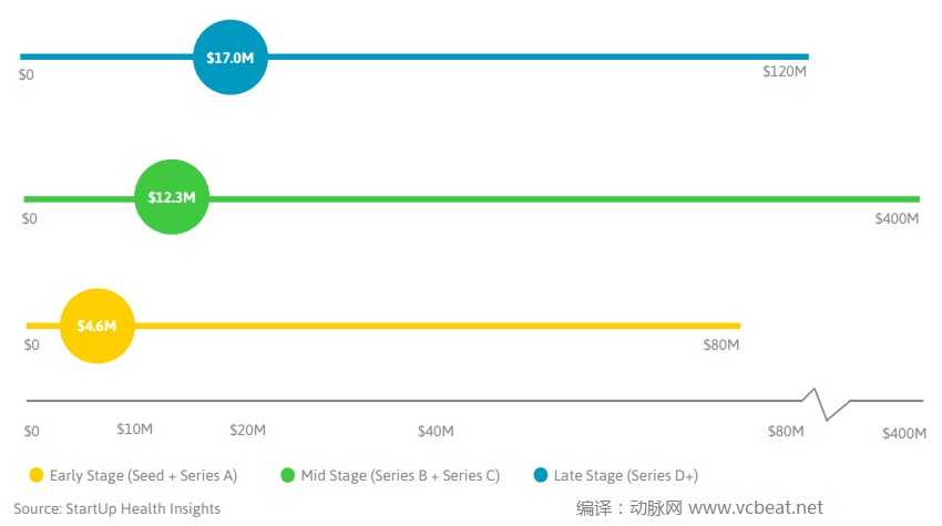 由于数字医疗市场相对比较年轻,在不同阶段的交易规模也有很多的变化。预计这种情况在2015年仍将继续。尽管交易规模相差很大,数字医疗仍继续显示出增长迹象:2014年中期阶段的交易数量从2013年的21%增长到28.6%。