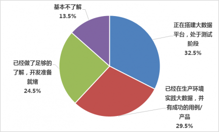 时至今日,无论你是来自互联网行业、通信行业,还是金融行业、服务业或是零售业,相信都不会对大数据感到陌生。据调查报告显示,32.5%的公司正在搭建大数据平台,处于测试阶段;29.5%的公司已经在生产环境实践大数据,并有成功的用例/产品;24.5%的公司已经做了足够的了解,开发准备就绪;基本不了解的只占3000+用户的13.5%。