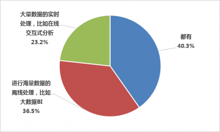 其中,大家对大数据平台提出的的主要需求有:36.5%是进行海量数据的离线处理,比如大数据BI;23.2%是为了大量数据的实时处理,比如在线交互式分析;40.3%的公司的大数据平台则同时负责这两种业务。