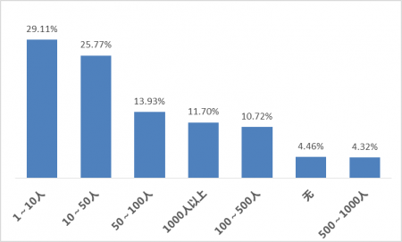 传统观念下,大数据往往是大型互联网公司的玩物。然而,通过本次调查,我们却发现在那些对大数据平台有需求的公司中,研发团队规模远没有我们想象的大,29.11%的研发团队仅有1-10人,次居第二的10-50人的规模占到了25.77%,两种规模的研发团队就超过了一半。可见,当下大数据的需求已不止步于大型公司。