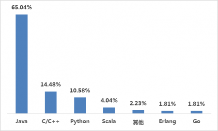 在众多的开发语言中,大数据平台开发者们尤为青睐Java,占到了总比例的65%, 远远超过其他开发语言。值得一提的是,Hadoop本身就由Java实现的。