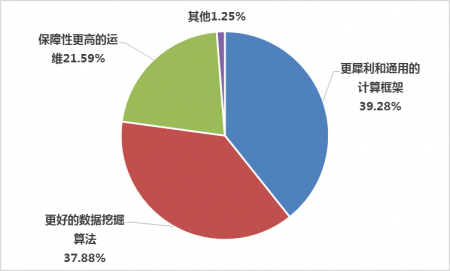 为了解决公司中的实际问题,39.28%的人希望拥有更犀利和通用的计算框架;37.88%的人希望能拥有更好的数据挖掘算法;21.59%的人则对保障性更高的运维有了更多的期盼。