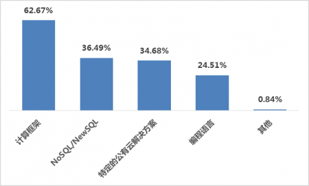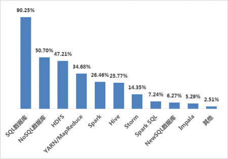 现有公司中,大数据平台已包含的部件位居前三的主要是SQL数据库(90.3%)、NoSQL数据库(50.7%)和HDFS(47.2%),在此基础上,公司计划添加的部件主要包含SQL数据库(57.2%)、Spark(41.5%)和NoSQL数据库(26.9%)。从各公司已有大数据部件和计划添加的部件可以看出,SQL数据库和NoSQL数据库在公司的大数据平台中发挥了重要的作用,得到了各公司的青睐。