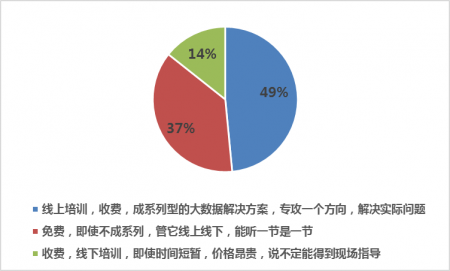技术培训能够对开发者起到一定的指导作用,使得听众可以系统全面的把握新技术的知识脉络,了解技术的发展趋势。在此次调查活动中,69.4%的被调查者表示从未参加过大数据平台构建的技术培训。对于技术培训的形式,49%的人希望是线上培训,收费,成系列型的大数据解决方案,专攻一个方向,解决实际问题;37%的被调查者还是希望免费进行技术培训,即使不成系列,无论是线上线下,能听一节是一节。虽然收费在一定程度上影响了开发者对大数据技术培训的热情,但是能够切实解决实际问题,得到技术和能力的提升,仍是相关技术人员追求的培训目标。