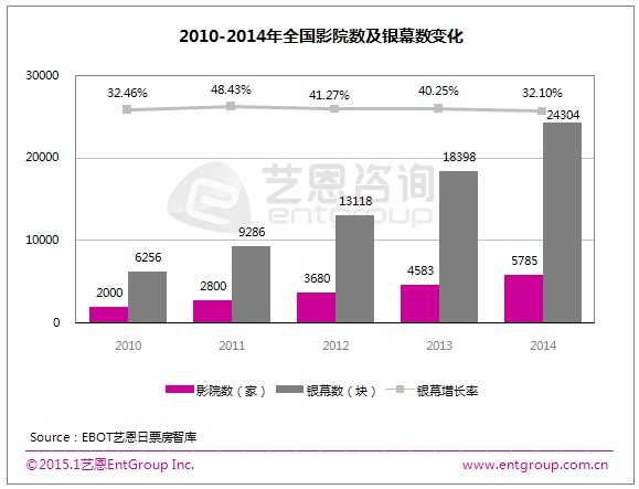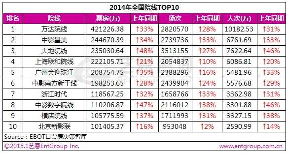 据EBOT艺恩日票房智库数据显示,2014年全国院线票房冠军为万达院线,总票房为421226.38万元,占全国票房比例14.32%,同比增长33%,蝉联5年冠军。大地院线票房增速最高为48%,首次进入前三甲。