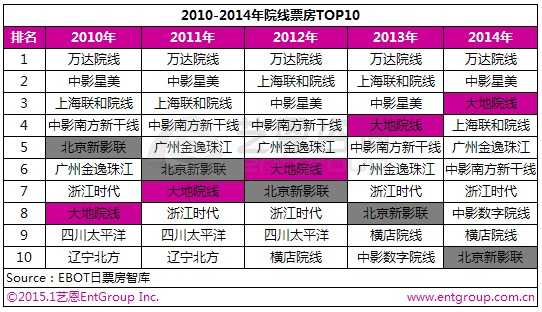 据EBOT艺恩日票房智库数据显示,2010-2013年全国TOP10院线前三甲连续四年被万达院线、中影星美、上海联合院线霸占。2014年大地院线成功挺进前三甲,获得季军。大地院线近5年影院数迅速增长,截至目前达到490家,但其运营效率不佳,较低的平均票价未带了较高的上座率。在影院数量的优势上应注重提高运营效率,在2015年有望超越中影星美院线。