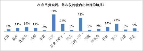 春节网友最向往的国内目的地前十是:三亚、云南、厦门、东北、九寨沟、桂林、成都、杭州、张家界、上海