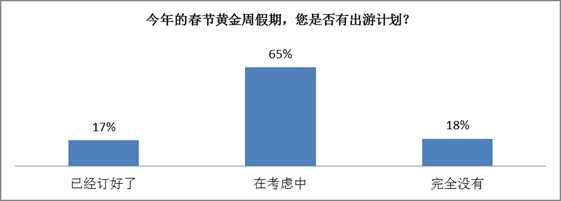 距2015年春节黄金周假期只有1个多月了,调查显示,有出行意愿的网民达到八成。17%的网民已经订好了出游计划,65%的网民仍在考虑中。18%的客户表示没有出游计划。