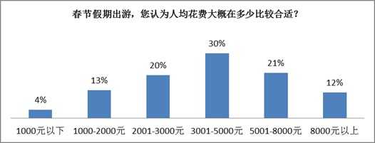 在消费水平上,国人也越来越有钱,在春节相比平时旅游更愿意花钱, 30%客户认为3001-5000元是较为合适的人均消费,有三分之一的被调查者将花每人5000元以上在旅游上。调查还发现,旅游者对价格的关注度随着年龄的增长而逐步降低。这主要因为40岁以上国人的消费能力相对较强,且更为看重春节出游对家庭的影响,愿意投入更高的旅游费用。